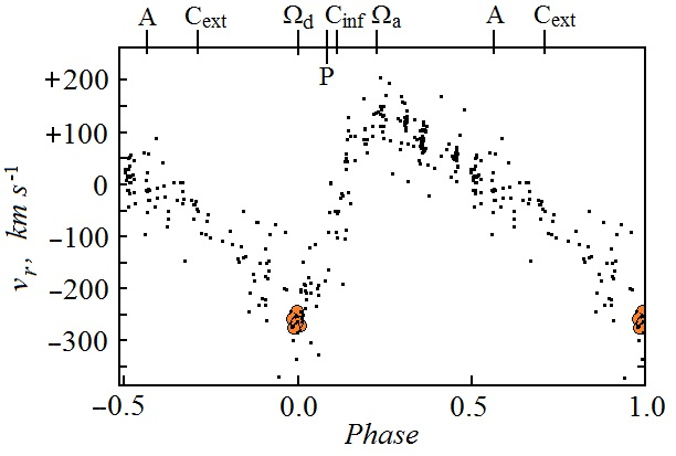 Рис. 1. Кривая лучевых скоростей эмиссии He II 4686 Å. Вверху обозначения орбитальных фаз. Наблюдения 31 октября 2023 года на BTA/ОЗСП отмечены оранжевым цветом.
