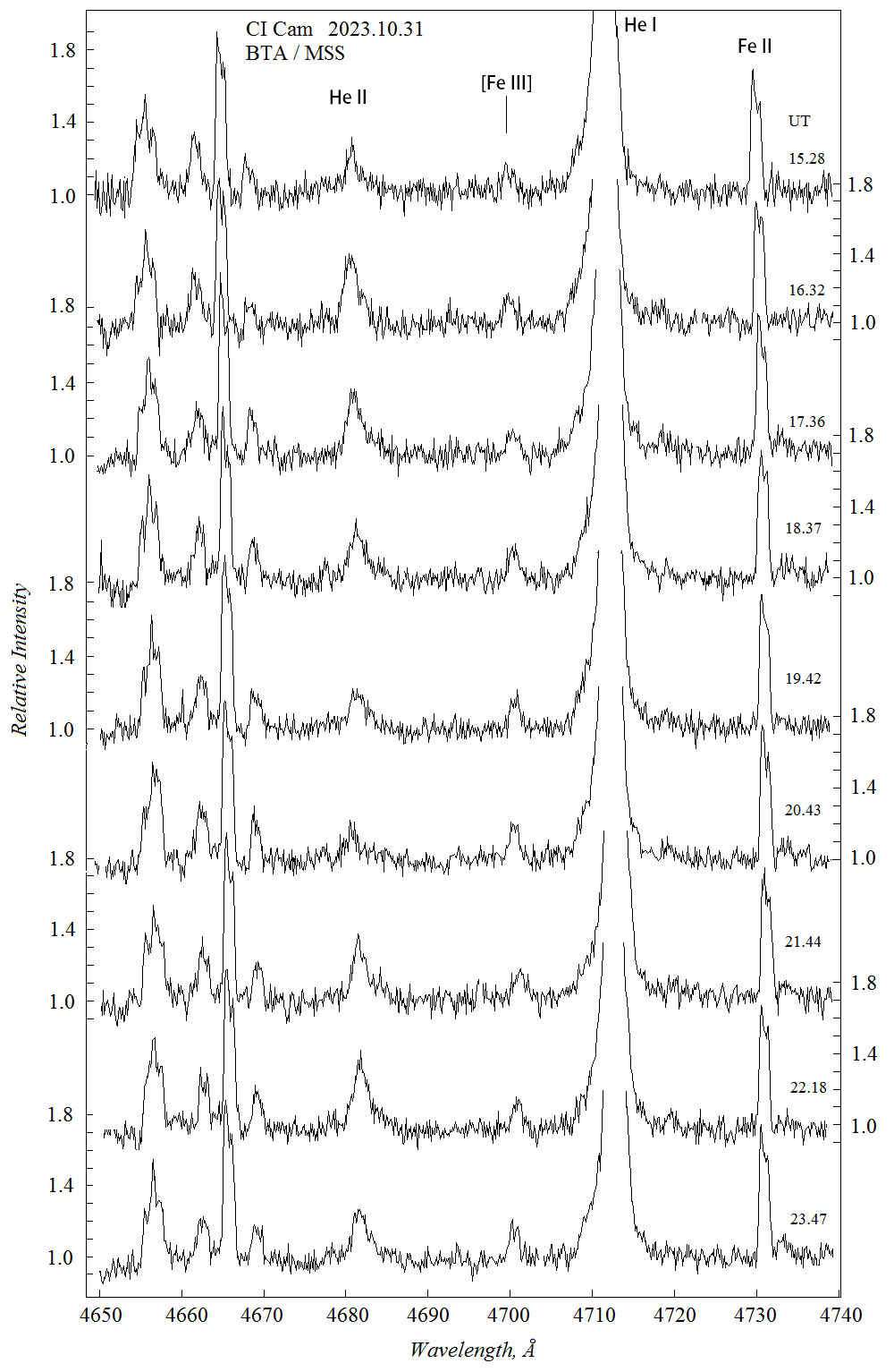 CI Cam — звезда с феноменом B[e], определяющими особенностями которого являются наличие запрещенных эмиссионных линий и избыток инфракрасного излучения, исходящего от околозвездной пыли. В 1998 году CI Cam пережила мощную вспышку, охватившую весь диапазон электромагнитного излучения — от гамма- до радиоволн. Природа ее дискутируется уже четверть века. Исследователи из САО РАН и ГАИШ МГУ с помощью фотометрического и спектрального мониторинга CI Cam показали, что её главный компонент — звезда спектрального класса B0–B2 I–III — пульсирует с периодом 0.402–0.416 суток и имеет спутник на эллиптической орбите с периодом 19.407 суток и эксцентриситетом 0.49. Орбитальное движение спутника прослеживается по изменению положения эмиссионной линии He II 4686 Å в спектре (Рис.1).