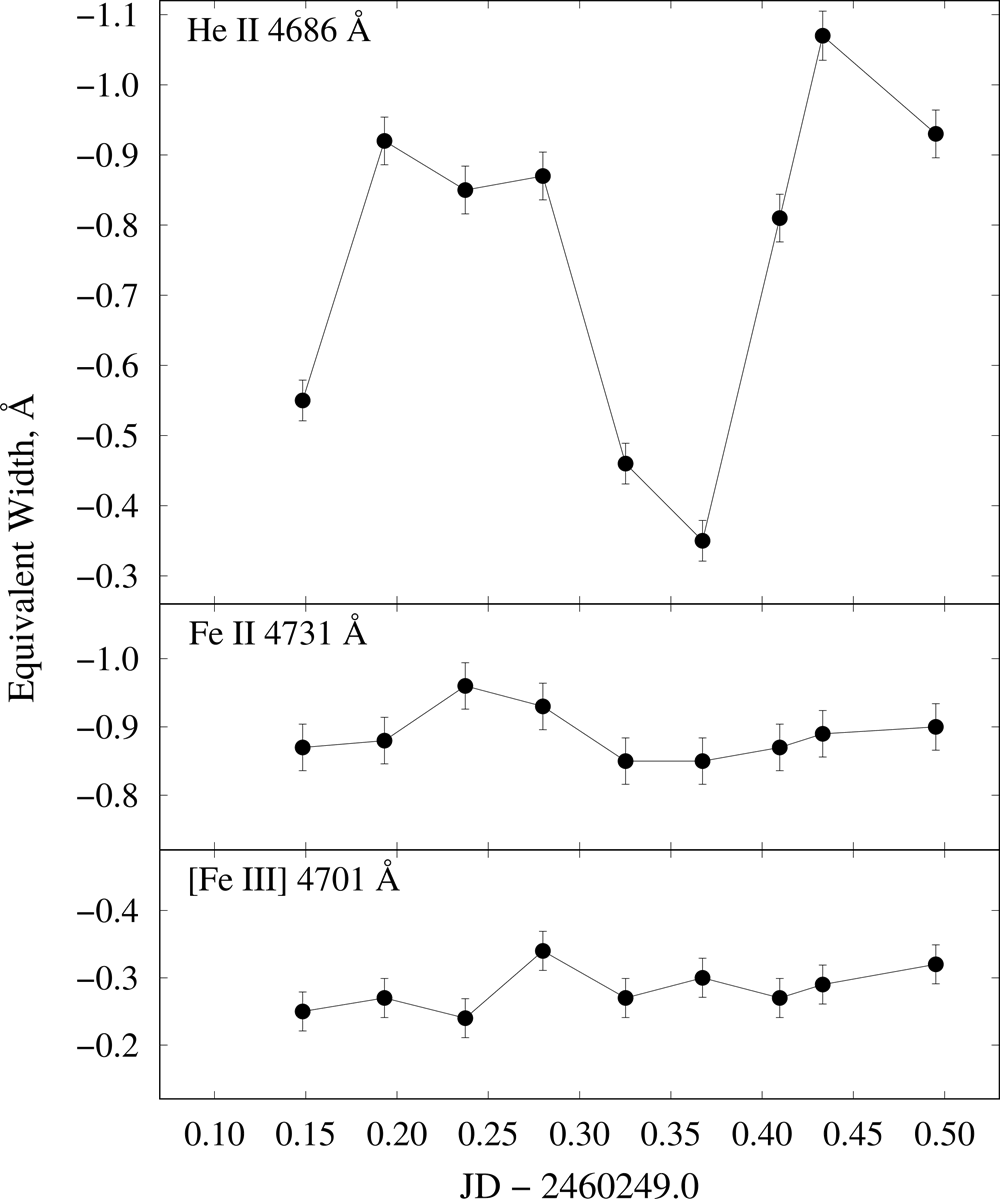 Рис. 2. Изменение эквивалентной ширины He II 4686 Å втрое за период наблюдения, равный периоду пульсаций (~9,5 час).
